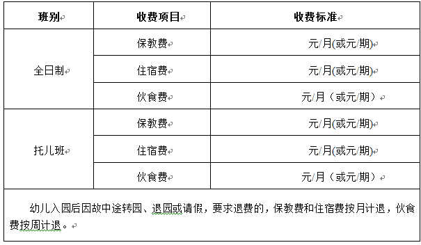 第十五条 保教费、住宿费和伙食费按月或按学期收取,不得跨学期收费。幼儿入园后因故中途转园、退园或请假,要求退费的,保教费和住宿费按月计退,伙食费按周计退。