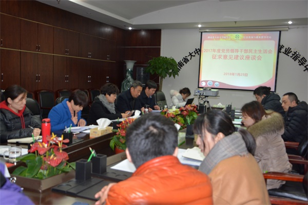 为开好2017年度民主生活会,2018年1月25日下午,湖南省大中专学校学生信息咨询与就业指导中心在三楼会议室召开党员领导干部民主生活会征求意见座谈会,紧扣民主生活会主题,广泛听取全体干部员工对中心领导班子及其成员的意见建议。中心党总支书记、主任曹敏、副主任夏学军参加座谈会。