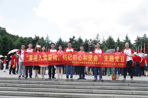 根据中共湖南省教育厅省委教育工委直属机关委员会《关于做好庆祝建党97周年有关工作的通知》文件精神,以实际行动庆祝建党97周年,2018年6月26日,湖南省大中专学校学生信息咨询与就业指导中心第一党支部党员赴伟人故里——韶山开展“重温入党誓词,铭记初心和使命”主题党日活动。