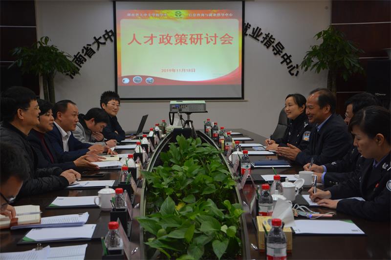 11月18日,省大中专学校学生信息咨询与就业指导中心组织召开人才政策研讨会,长沙市公安局人口与出入境支队支队长刘辉、党委副书记黄进等公安系统人员,长沙理工大学、中南林业科技大学、湖南交通职业技术学院相关部门负责人等高校代表参加会议。省就业指导中心主任曹敏主持,调研员李昌维参加会议。