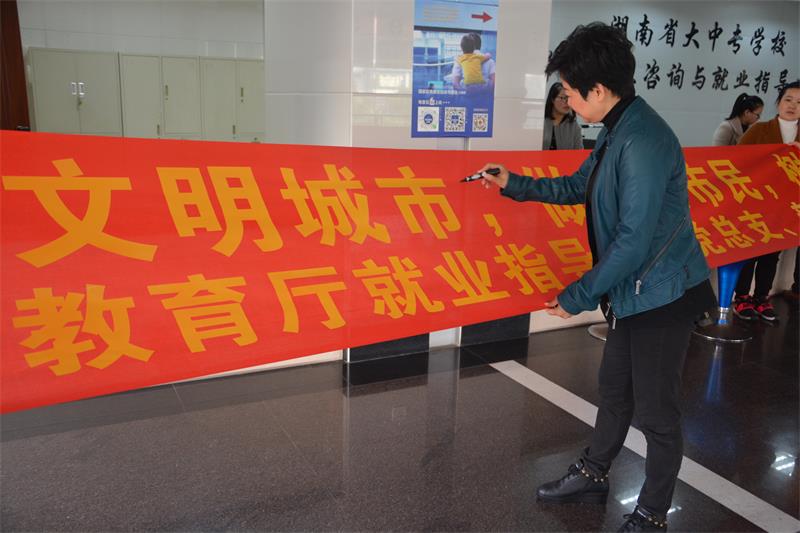 中心党总支书记曹敏在文明城市创建横幅上承诺签名