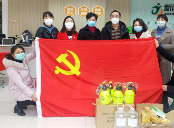 2月12日上午,省就业指导中心党总支书记、主任曹敏带领疫情防控党员突击队、疫情防控青年突击队来到东塘街道新雨社区,向奋战在一线的社区工作者致以最崇高的敬意,并向社区捐赠医用酒精、加厚胶手套、消毒液、高压浇水壶等一批价值约3000元的防疫物资。