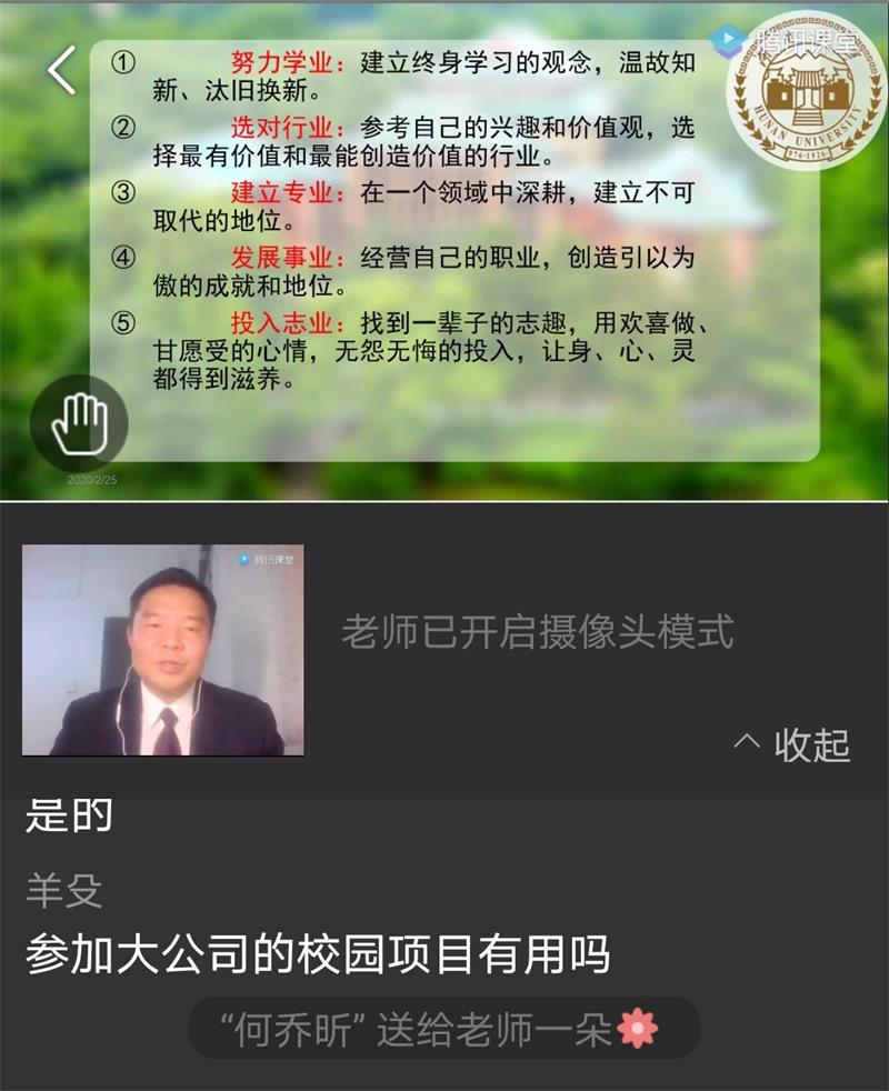疫情阻挡了师生的相聚,却阻挡不了知识的分享、思想的传递,线上直播交流如期开课。第一次以直播的形式与学生互动交流,对于老师是很大的考验。本次直播嘉宾湖南大学贺迅老师以“你问我答,聊聊我们的就业未来”为题吸引了1800多名毕业生进入直播间参与学习与咨询。千人课堂,把大家聚集在一起,相互交流与学习,一起感受学习的气氛。