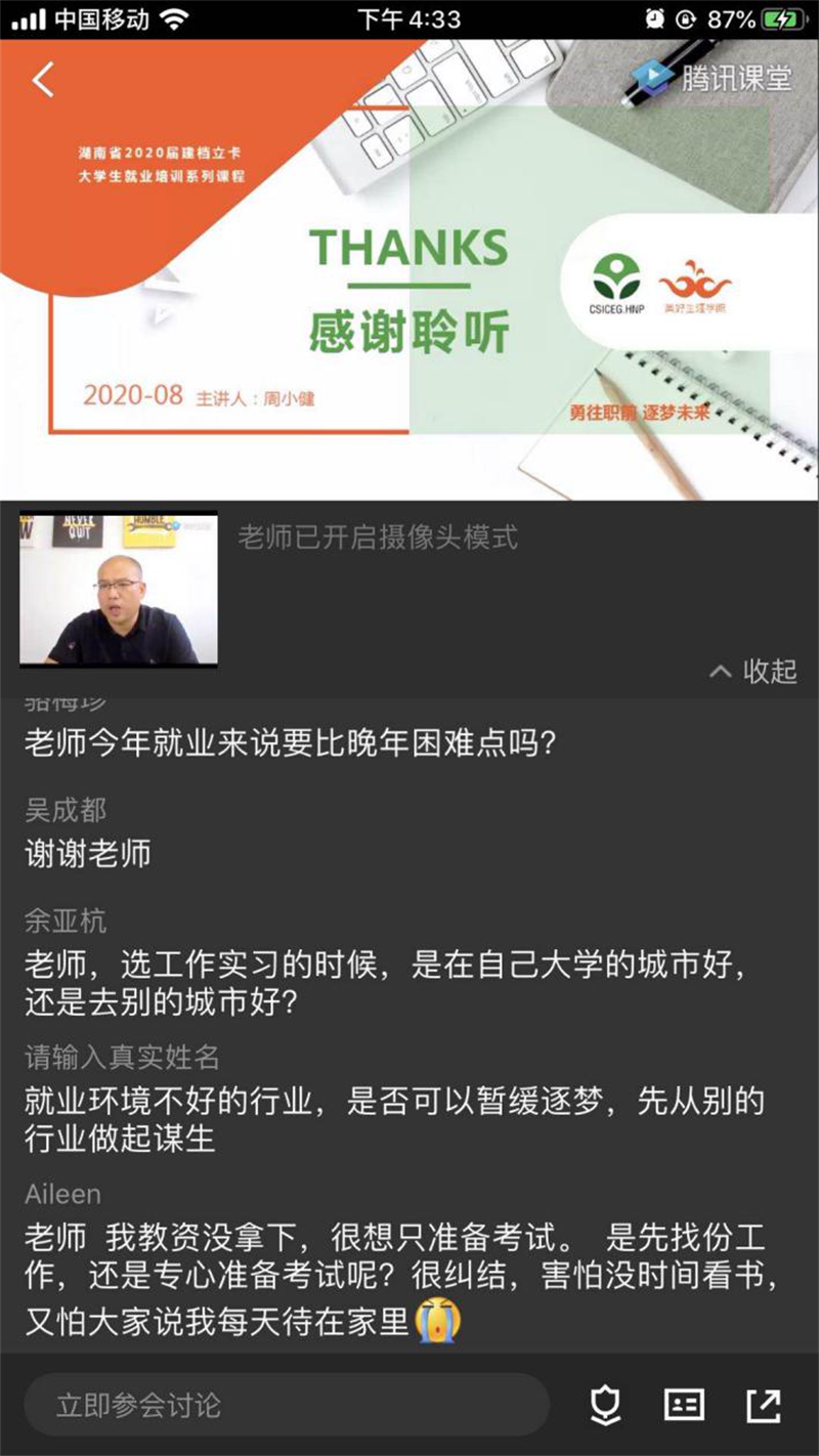 此次直播课程持续了一个半小时,在直播过程中,各位同学在评论区积极交流自己的观点和看法,课堂谈论氛围浓烈、气氛轻松活跃,很多同学表示,通过这一期课程,大家受益良多,对做好今后的职业生涯规划有了现实的指导。接下来一段时间,湖南省就业指导将持续开展5场针对建档立卡毕业生就业指导培训,为广大学子提供更加精准有效的就业指导服务。