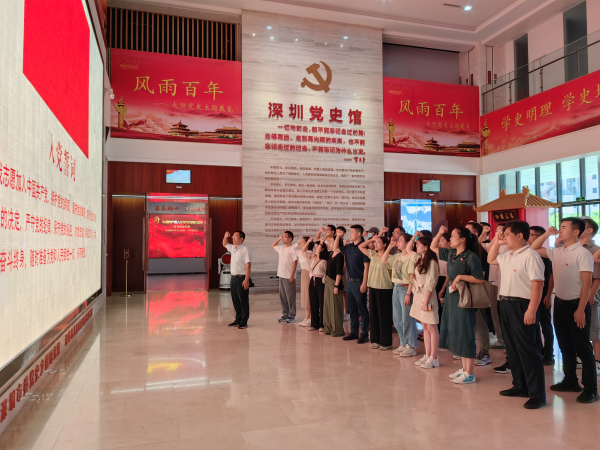 本次活动特别邀请了中共深圳市委党史文献研究室一级调研员詹延钦讲授了一堂高质量的党课。他以《凝心铸魂向复兴》为主题,讲解了主题教育学习的目的及意义、伟大复兴召唤历史使命、新思想创立的时代背景、新思想主要内容、学懂弄通做实走好复兴路等方面的内容,帮助党员更好地领悟习近平新时代中国特色社会主义思想的深刻内涵。党课结束后,全体党员参观学习了深圳党史馆的陈列展出,重温了入党誓词,铿锵有力的宣誓声响彻大厅。