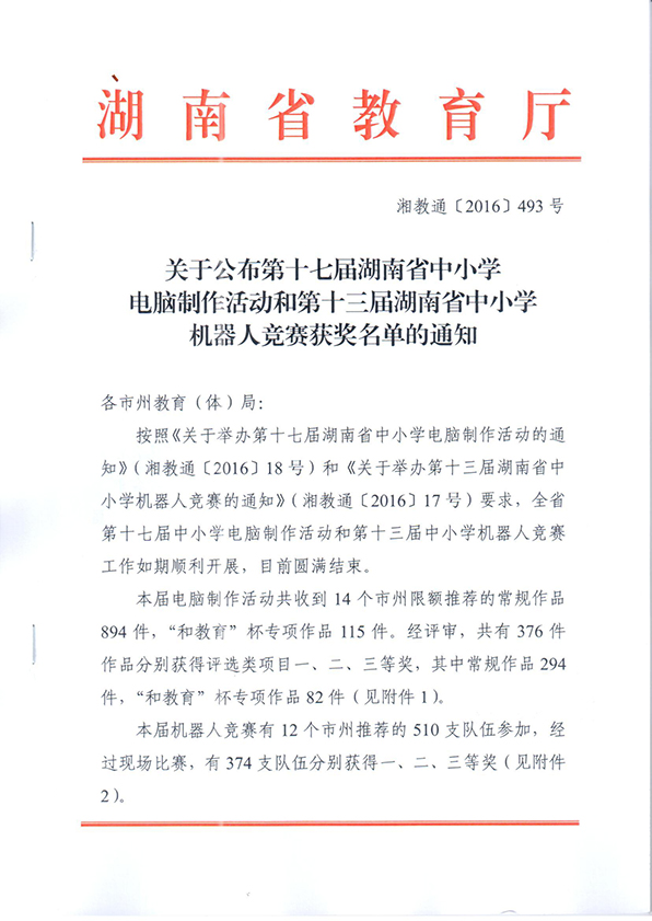 关于公布第十七届湖南省中小学电脑制作活动和第十三届湖南省中小学机器人竞赛获奖名单的通知