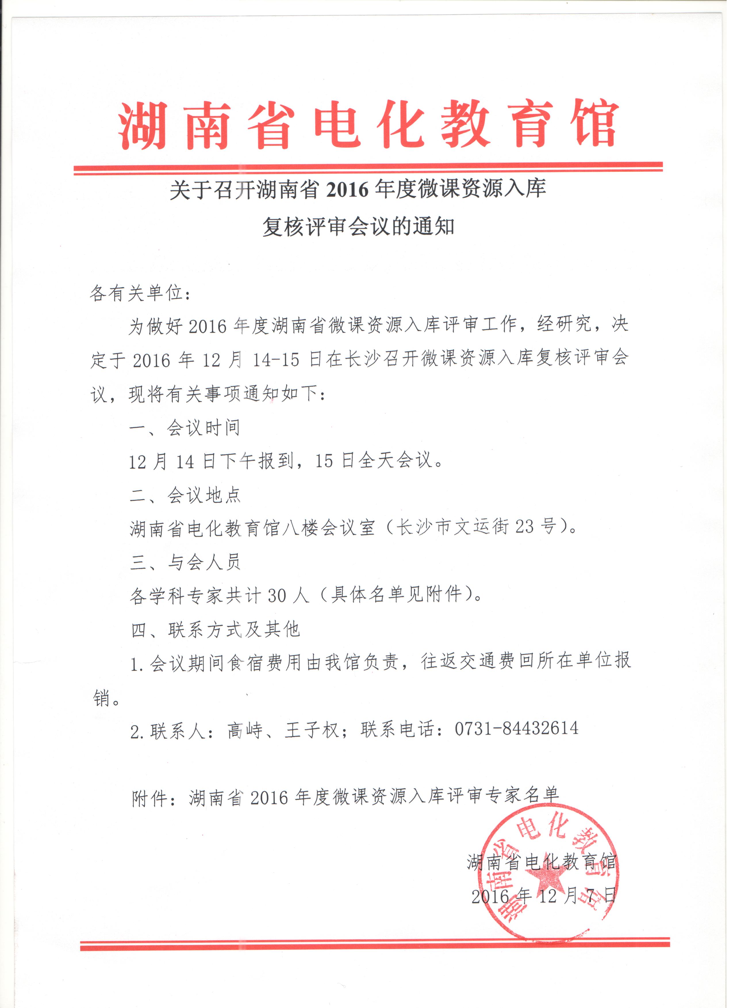 关于召开湖南省2016年度微课资源入库复核评审会议的通知