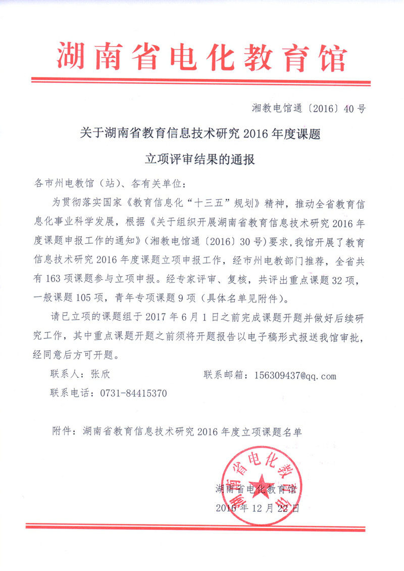 关于湖南省教育信息技术研究2016年度课题立项评审结果的通报