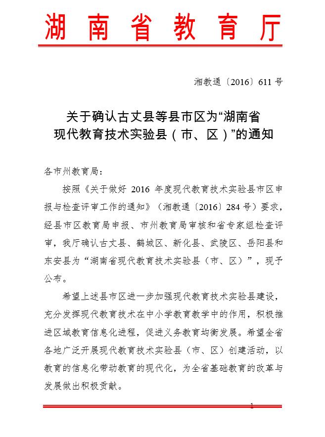 转发关于确认古丈县等县市区为“湖南省现代教育技术实验县(市、区)”的通知