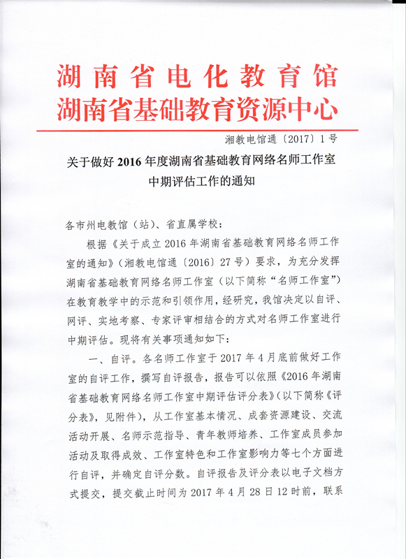 关于做好2016年度湖南省基础教育网络名师工作室中期评估工作的通知