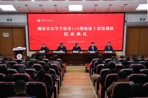 12月5日下午,湖南省高等学校第146期处级干部培训班在湖南文理学院图书馆报告厅举行结业典礼。湖南省委教育工委党校常务副校长、湖南省高校干部培训中心书记、主任刘国华,湖南省高校干部培训中心副主任蒋理,湖南文理学院全体在家党政班子成员、培训班学员、副处级以上干部(含挂职干部,芙蓉学院系部副主任)参加典礼。学校党委副书记、校长刘宇文主持典礼。