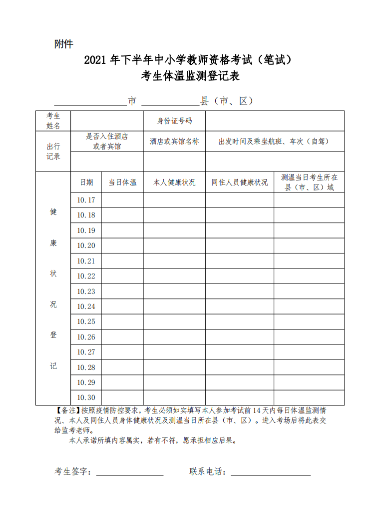 1.考生须在本人考前14天内进行自我体温监测(10月17日-30日),自行下载打印、如实填写体温监测登记表(附件)并签字;考生每单元考试进入考场时,均须将一份填写完整的体温监测登记表交给监考老师,在进入考点时必须核验健康码、行程码。
