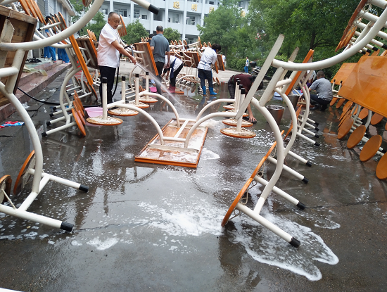 食堂工人冲洗餐桌