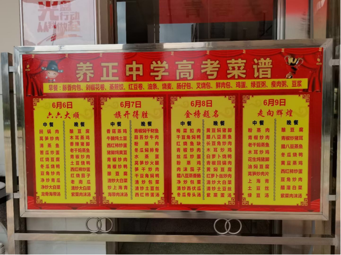 据悉,养正中学食堂同时向本校学生和外校在养正中学考点考试的学生供餐。“六六大顺”“旗开得胜”“金榜题名”“走向辉煌”,这是食堂高考期间每天独具特色的菜谱名称,也寓意着对考生最真心的祝福。