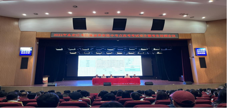 为全面动员和部署做好2024年普通高考考务工作,规范考务操作,明确岗位职责,确保高考期间各项工作顺利进行,6月5日上午8:30,张家市民族中学考点举行了高考安全暨考务培训会议。张家界市民中考点主考谭镇,市教育局驻点巡视领导谭辉武,永定区政协副主席、考点联系领导宋娟,区教育局副局长、驻考点联系领导张晚云,区纪委监委常委宋祖文等领导参加了培训会。会议由考点副主考杜方翔主持。