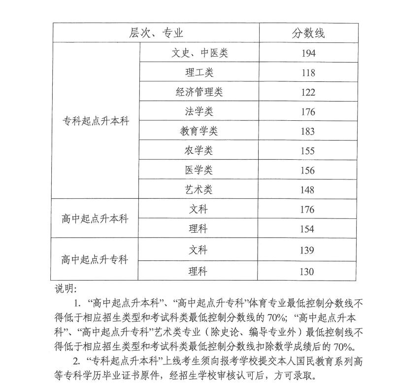 湖南省2018年成人高校招生录取控制分数线