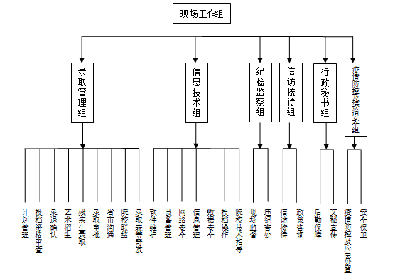 2.录取现场指导监督小组及职责。在录取工作领导小组的领导下,主要负责协调、督促录取现场各部门、各环节工作的正常运转,全程跟踪、监控每一个流程的工作;负责工作运转中重大事项的决定和异常情况的处理,研究处理录取过程中出现的紧急情况。