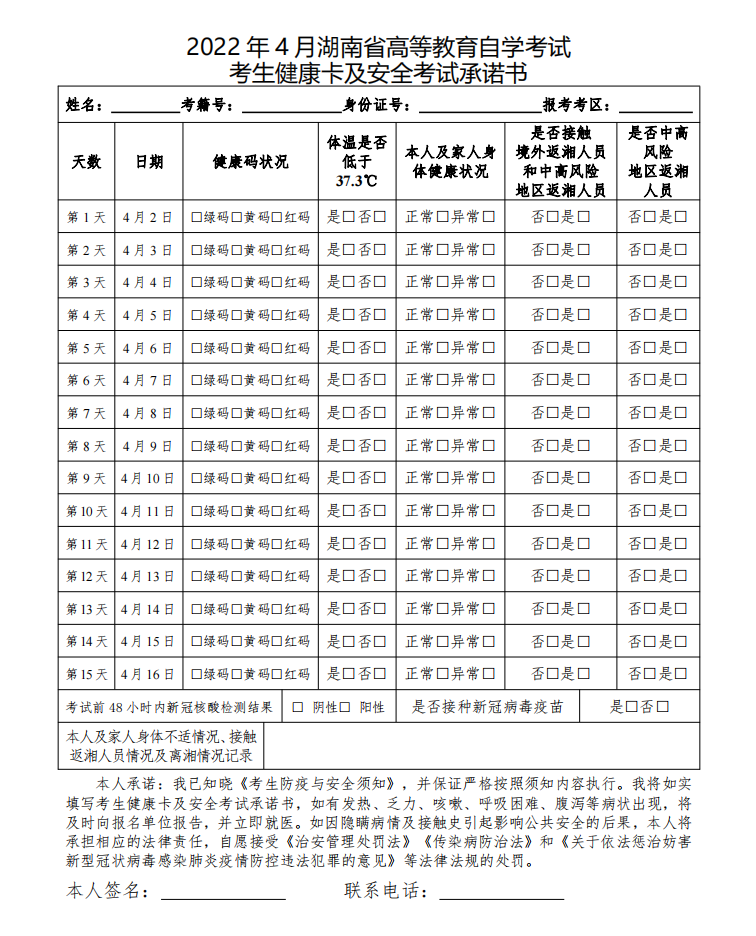 附件:2022年4月湖南省高等教育自学考试考生健康卡及安全考试承诺书(点击下载)