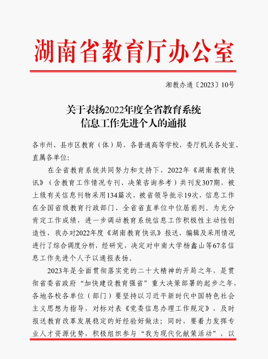 近日,湖南省教育厅办公室发出《关于表扬2022年度全省教育系统信息工作先进个人的通报》,我院李小球、郭尚武、欧卫星、王可4人获评2022年度全省教育系统信息工作先进个人。2022年,全省共通报表扬了9个市州、6个县(市、区)教育局、17所本科院校和8所高职(专科)院校、6个直属单位信息工作先进个人。我院获得表扬人数在全省教育系统排名第一。