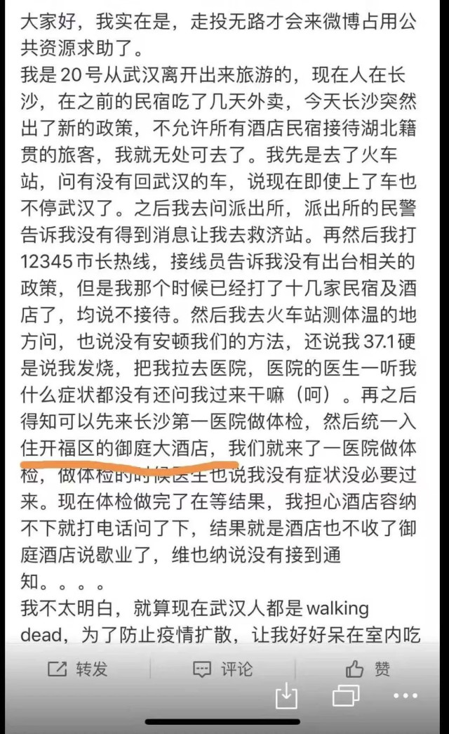 1月26日晚间,微博名为绿豆糕的网友发文称其在20日来长沙旅游,称长沙各大酒店民宿现不接待湖北籍外地旅客,而火车站也无法在武汉站停留,寻求民警帮助和拨打求助热线无果,又在医院得知旅客被安排在开福区御庭大酒店之后,仍然没有得到妥当安排,不得不发文求助。