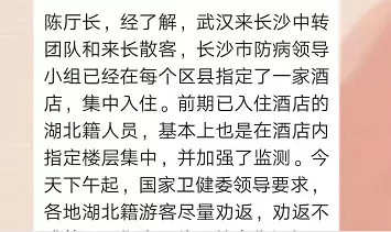 记者致电湖南省文旅厅,针对武汉旅客情况,湖南省文化和旅游厅厅长、党组副书记陈献春非常重视,而且立即做出了回复:武汉来长沙中转团队和来长散客,长沙市防病领导小组已经在每个区县指定了一家酒店,安排他们集中入住。而前期已经入住酒店的湖北籍人员,基本上也是在酒店的指定楼层集中,并加强了检测。与此同时,根据国家卫健委要求:将各地湖北籍旅客尽量劝返。