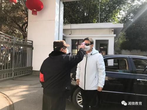 唐亚武进大门前主动接受工作人员测量体温。