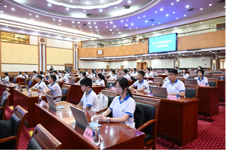 6月25日上午,省人大常委会开展机关开放日活动,来自长沙市中雅培粹学校的五十余名初三学生在中考结束后走进省人大常委会机关,沉浸式感受湖南民主法治建设,上了一堂生动的思政课。
