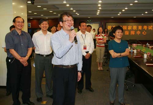 今天(6月7日)是全国统一高考的第一天。上午,教育部党组副书记、副部长陈希,教育部党组成员、部长助理林蕙青,来到教育部考试中心,亲切看望高考一线的工作人员,并通过国家教育考试指挥平台视频巡查系统检查全国高考组织工作,巡查了解四川、辽宁等13个省份考场情况。 陈希强调,2009年恰逢建国60周年。高考作为我国社会生活中的一件大事,事关老百姓的切身利益,事关教育公平和社会稳定,做好今年的高考工作,任务艰巨,责任重大。要以高度的政治意识、大局意识、责任意识和忧患意识,振奋精神,严格管理,优化服务,切实做好安全保密、考风考纪以及甲型H1N1流感疫情防控工作,确保考试安全、平稳进行,确保考生和考试工作人员的身体健康,办好让人民满意的高考。 在视察中,陈希还通过视频巡查系统与四川、西藏、浙江等省区负责同志通话,听取了有关情况介绍,希望他们克服重重困难,再接再厉,精心做好考试、评卷、录取等工作,顺利完成今年高考和改革各项任务。