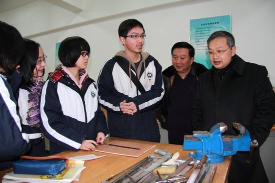 王柯敏与正在做小制作的学生亲切交流,长沙市一中校长赵雅茜(右二)作介绍