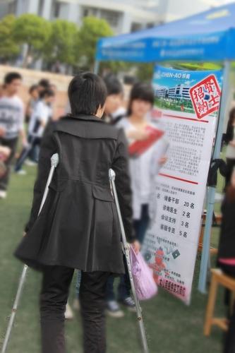 手拄双拐的大学毕业女生在招贤纳士的招聘位前细细观看招聘启事。