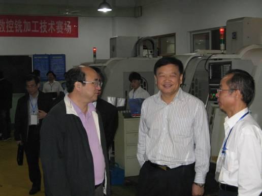 张放平(中)、王键(左)在沙航空职业技术学院现场观摩数控铣加工比赛并与裁判员交流。