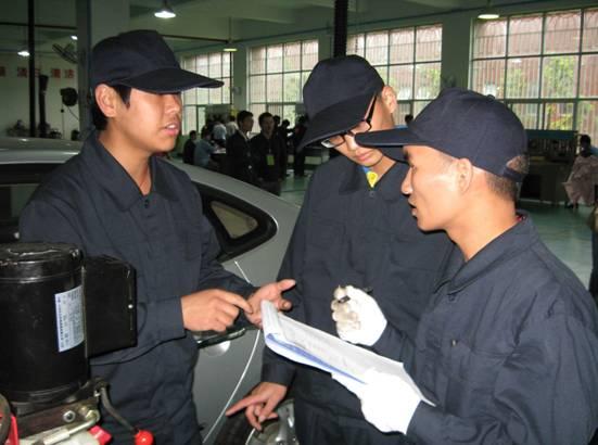 下午两点,湖南交通职业技术学院汽车检测与维修比赛现场,两组一批次的汽车综合故障诊断正在紧张进行之中。“发动机启动困难,肯定是水温传感器接触不良,赶快检修!”“项目组长”赵亮一声令下,另外两名同伴马上与他一起展开专业检测维修。三个学生伢子顶个高级技工,半小时之后,在三名小组成员的通力配合下,汽车发动机发出了正常的启动轰鸣声,场边随时观察的现场裁判给出了鼓励笑容。这三位身着整齐工作服、训练有素、临场不乱的“小师傅”,来不及擦拭脸上的汗水,他们又立马投入到下一个环节的比赛当中。