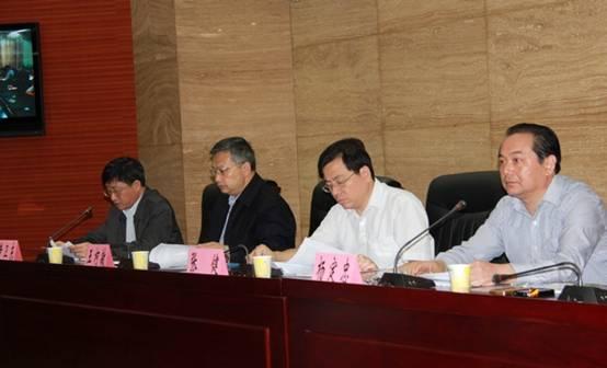 省政府办公厅党组成员黄卫东(左一)主持会议。省教育厅副厅长杨定忠(右一)总结我省农村义务教育学生营养改善计划工作情况,就做好下阶段工作作了安排。