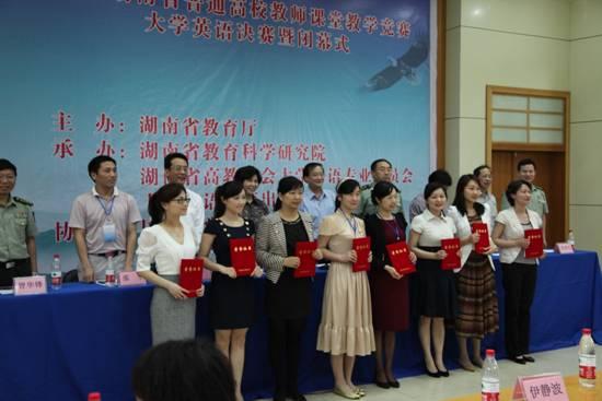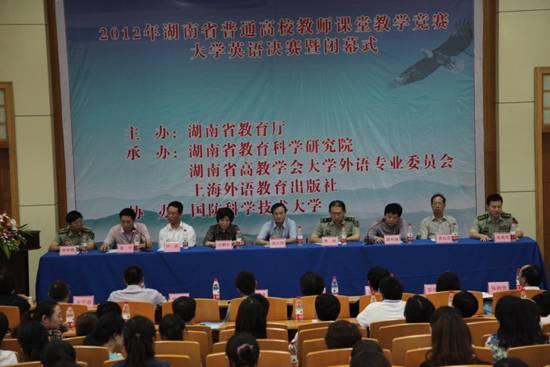 6月2日上午,2012年湖南省普通高校教师课堂教学竞赛大学英语现场决赛暨闭幕式在国防科学技术大学3号院举行。本次竞赛活动由湖南省教育厅主办,湖南省教育科学研究院、湖南省高教学会大学外语专业委员会和上海外语教育出版社共同承办,国防科学技术大学协办。省教育厅党组成员、省教育科学研究院院长姜正国出席闭幕式并讲话。国防科学技术大学教育长曾淳少将、上海外语教育出版社总编严凯先生分别在闭幕式上致辞。闭幕式由省教育厅高教处处长唐利斌主持。