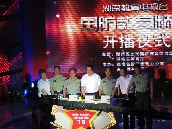 8月1日建军节上午,湖南教育电视台演播厅,在雄壮、喜庆的音乐声中,出席开播仪式的有关领导、嘉宾共同启动湖南教育电视台国防教育频道。