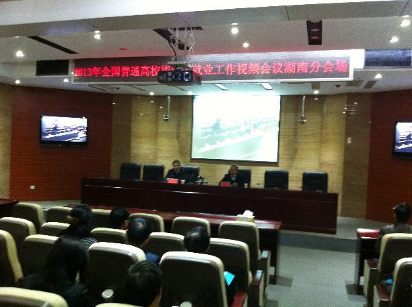 为认真学习贯彻党的十八大精神,总结2012年全国普通高校毕业生就业工作,全面部署2013年全国普通高校毕业生就业工作,教育部于2012年11月21日召开了2013年全国普通高校毕业生就业工作网络视频会议。教育部党组副书记、副部长杜玉波出席会议并发表重要讲话。教育部党组成员、部长助理林蕙青主持会议。湖南省委教育工委书记,省教育厅厅长王柯敏出席了湖南分会场会议并作了具体的就业工作部署。省教育厅副厅长申纪云主持会议。省教育厅相关处室负责人;全省高校党委书记或校长、分管就业工作的副书记或副校长以及职能部门负责人;市州教育局分管局长及职能科室负责人参加了会议。