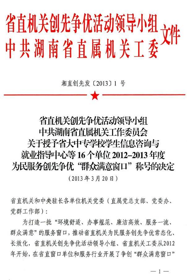 3月26日,省直工委与省委外宣办联合召开省直机关“改进作风、为民服务”新闻发布会,就省直机关“改进作风、为民服务”有关情况向新闻界的朋友作介绍,并对获评2012-2013年度为民服务创先争优“群众满意窗口”称号的单位予以授牌,省教育厅党组成员、省委教育工委委员王玉清,省教育厅机关党委专职副书记喻志松参加会议,湖南省大中专学校学生信息咨询与就业指导中心作为获评单位接受授牌。