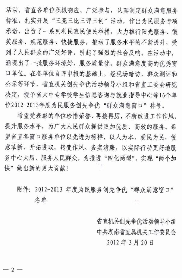 在为民服务创先争优“群众满意窗口”创建过程中,我厅积极组织有关单位申报,并邀请中共湖南省直属机关工委巡视员高建雄到我厅就业指导中心现场指导创建工作。作为我厅直接面向大中专毕业生的窗口单位,就业指导中心始终坚持以服务为宗旨,以促进毕业生就业为目标,不断改进服务作风,提高服务水平。通过增设对外开放日,在7、8月份开放周六对外办理毕业生就业手续,以及简化毕业生就业手续办理流程,服务效能得到进一步提高,服务大厅日均接待毕业生约300人次,日均接受电话咨询100人次,年均网上回复1874人次。通过广泛开展“三亮三比三评”活动,大力推行阳光服务、微笑服务、规范服务、便民服务,全体员工服务意识、服务水平得到大力提升。通过配备现代化的服务设备,设置人性化、便利化的综合服务大厅,为服务对象营造舒适的办事环境。通过“每周集中学习1小时”员工政治业务学习和优秀员工评比等,全面加强内部管理,服务内涵得到有效提升。2012年,我厅就业指导中心先后获评湖南省农村义务教育阶段学校教师特设岗位计划实施工作先进单位、全省教育系统创先争优先进基层党组织、2012年度省直单位档案工作先进单位。