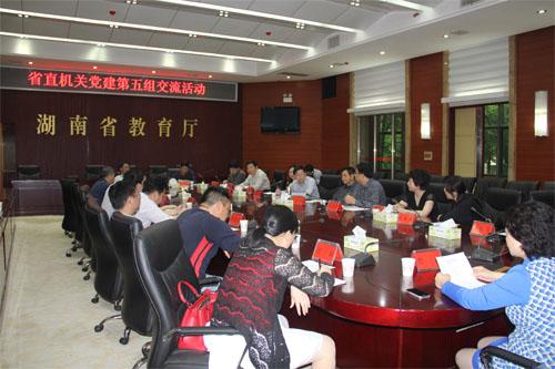 2014年5月8日下午,省直机关党建工作第五联系组在我厅开展交流活动,学习交流贯彻落实《湖南省贯彻落实<中国共产党党和国家机关基层党组织工作条例>的实施办法》(以下简称《实施办法》)情况。省直工委副书记李爱武同志,省教育厅党组成员、省委教育工委委员王玉清同志,省直工委综调室、组织部有关领导及省直机关党建第五组机关党委专职副书记参加了活动。