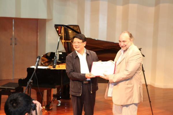 肖国安为迈克·阿尔卡杰夫颁发“俄籍钢琴艺术家巡讲活动主讲专家”聘书