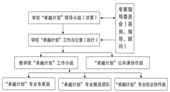 学校为加强对“卓越计划”实施工作的组织、领导、管理、协调,成立了基于学校、教学院(部、中心)、专业等不同层面的各类工作组织,形成了一个层次清晰、职责明确、责权利平衡的组织管理体系,如图1所示。