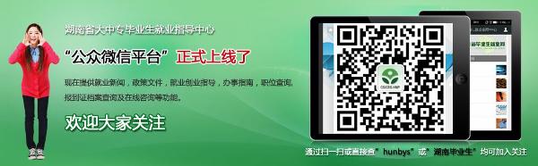 9月2日,湖南省大中专学校学生信息咨询与就业指导中心“公众微信平台”正式开通,您只需在手机微信的公众服务号中搜索“hunbys”或“湖南毕业生”,或者直接在微信中扫描上面的二维码添加关注,就可获得相关就业咨询服务。