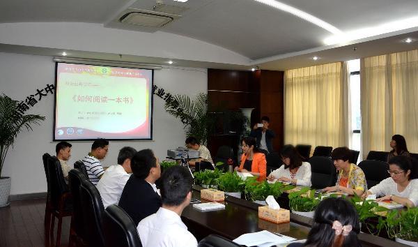 5月8日,湖南省大中专学校学生信息咨询与就业指导中心举行2015年第13期员工政治业务学习,邀请天心阅读文化网一级讲师李静做《如何阅读一本书》专题讲座。省就业指导中心主任曹敏为青年代表赠书,并勉励全体干部职工要在工作生活中多读书,读好书,以书为友,以学为伴,不断提高自身素质,陶冶情操。省就业指导中心全体员工参与学习。