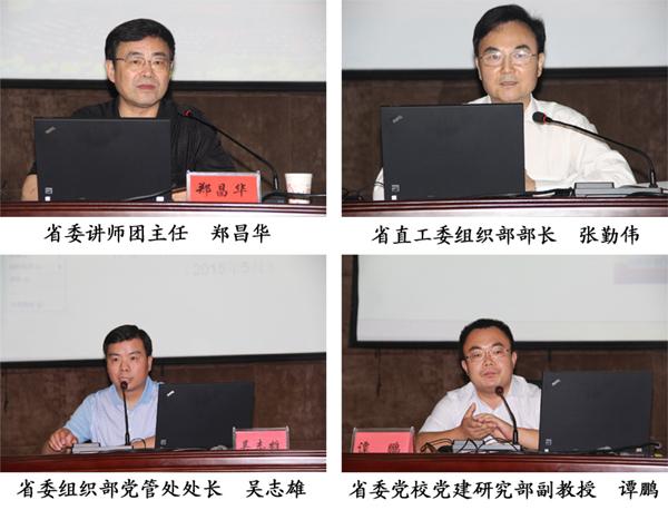省委讲师团主任郑昌华同志以“引领中华民族伟大复兴的战略布局”为主题,带领学员开始了第一堂关于习近平总书记“四个全面”精神的学习课程。省直工委组织部部长张勤伟同志以党支部书记的综合素养为题,从政治素养、基本知识素养和工作能力素养三个方面,结合个人工作实际探讨如何提高与体现一个党支部书记的综合能力,从而充分发挥党员干部的先锋模范作用。省委组织部党管处处长吴志雄同志着重就基层党支部在发展党员和管理党员过程中遇到的相关问题,以最新的《发展党员工作细则》的修订内容进行了详细的讲解,并在随后活跃的互动环节中认真耐心的回答了部分学员关于入党积极分子接续培养、流动党员的管理等在新形势下遇到的新的工作难题。省委党校党建研究部谭鹏博士通过讲解党章在党的历史中不断与时俱进的演进,让全体学员认识到唤醒党章党纪意识,推动全面从严治党是当前党内工作的重中之重,谭鹏同志还为党员干部提出了建设服务型基层党组织的宝贵建议,希望各基层党组织能坚持走以服务促建设,以服务赢民心的党的群众路线。