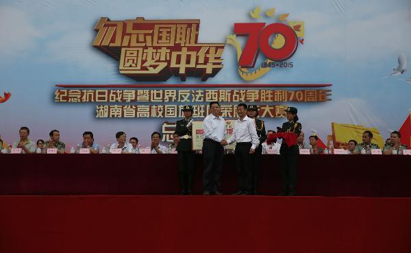 今年是中国人民抗日战争暨世界反法西斯战争胜利70周年,“勿忘国耻 圆梦中华—纪念抗日战争暨世界反法西斯战争胜利70周年湖南省高校百万师生签名活动暨国旗班风采展示大赛”旨在激发广大青年学子的爱国热情,更好地推进我省国防教育工作的发展。