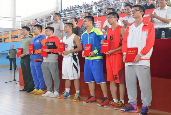在热烈的掌声中,主席台就坐的领导和嘉宾为获奖代表队和获奖运动员颁奖,余伟良宣布本届篮球联赛正式闭幕。