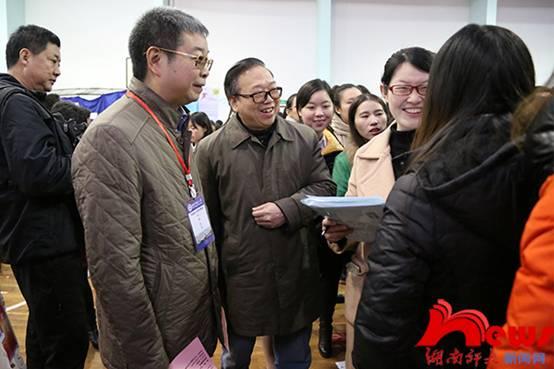 12月19日上午,由湖南省教育厅委托湖南师范大学承办的2016届师范类高校毕业生暨湖南师范大学毕业生冬季大型招聘会在湖南师范大学体育馆举行。省教育厅学生处处长熊俊钧、省大中专学校学生信息咨询与就业指导中心副主任钟秋明、学校副校长周俊武等到招聘会现场看望工作人员和应聘毕业生。