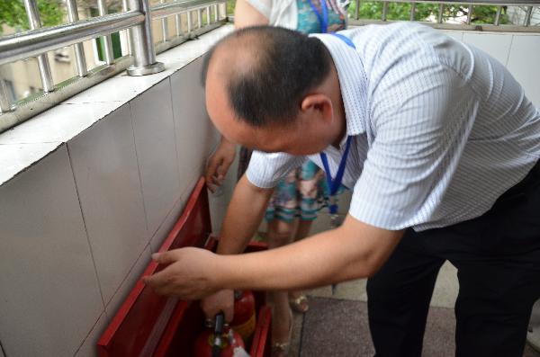 随后,董海军、彭运莲巡查了校园的消防安全设施。董海军亲自取出消防设施箱的灭火器,仔细查看压力表、铅封、瓶口、虹吸管、喷嘴和出厂合格证。他强调安全工作是学校重中之重。灭火器必须每月检查,半年更换一次。