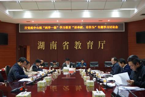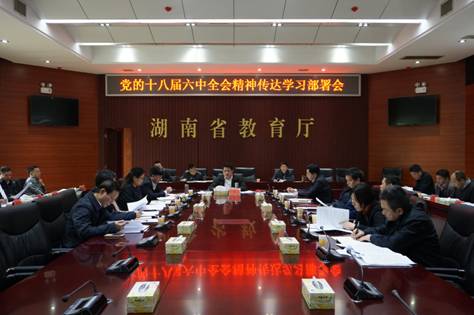 11月3日下午,省教育厅党组书记、厅长,省委教育工委书记肖国安主持召开2016年第九次厅党组中心组(扩大)学习会,传达学习了党的十八届六中全会精神和教育部《关于认真学习贯彻习近平总书记在纪念红军长征胜利80周年上的重要讲话的通知》精神;深入学习了《中共湖南省委办公厅印发<关于全面落实纪委向省一级党和国家机关派驻纪检机构的方案>的通知》;开展了“两学一做”学习教育“讲奉献、有作为”的学习讨论。厅委全体领导以及省教育工会、省教育考试院、厅机关各处室负责人参加了当天的学习研讨。