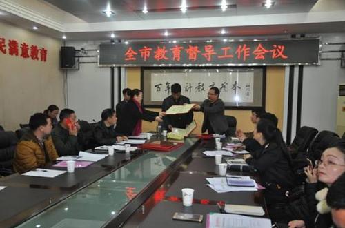 副主任督学刘智红宣读了2016年度教育督导工作先进单位和先进个人表彰决定,并就如何抓好教育督导工作,谈了几点建议与大家共勉。督导室孙志奇同志就今年教育督导的重点工作及当前几项重点工作作了部署安排。2017年,我市教育督导工作重点要抓好八件大事:一是认真组织好第三轮县级政府教育工作“两项督导评估考核”和“义务教育发展基本均衡县”评估考核验收;二是要继续抓好督学责任区建设与管理工作;三是要加强教育督导信息化建设,实现教育督导与教育信息的深度融合;四是要认真组织并开展好6次专项督查;五是要开展义务教育质量监测试点;六是要继续完善对教育行政部门年度绩效考核工作;七是要不断加强教育督导自身建设;八是要努力抓好教育督导信息报送工作。